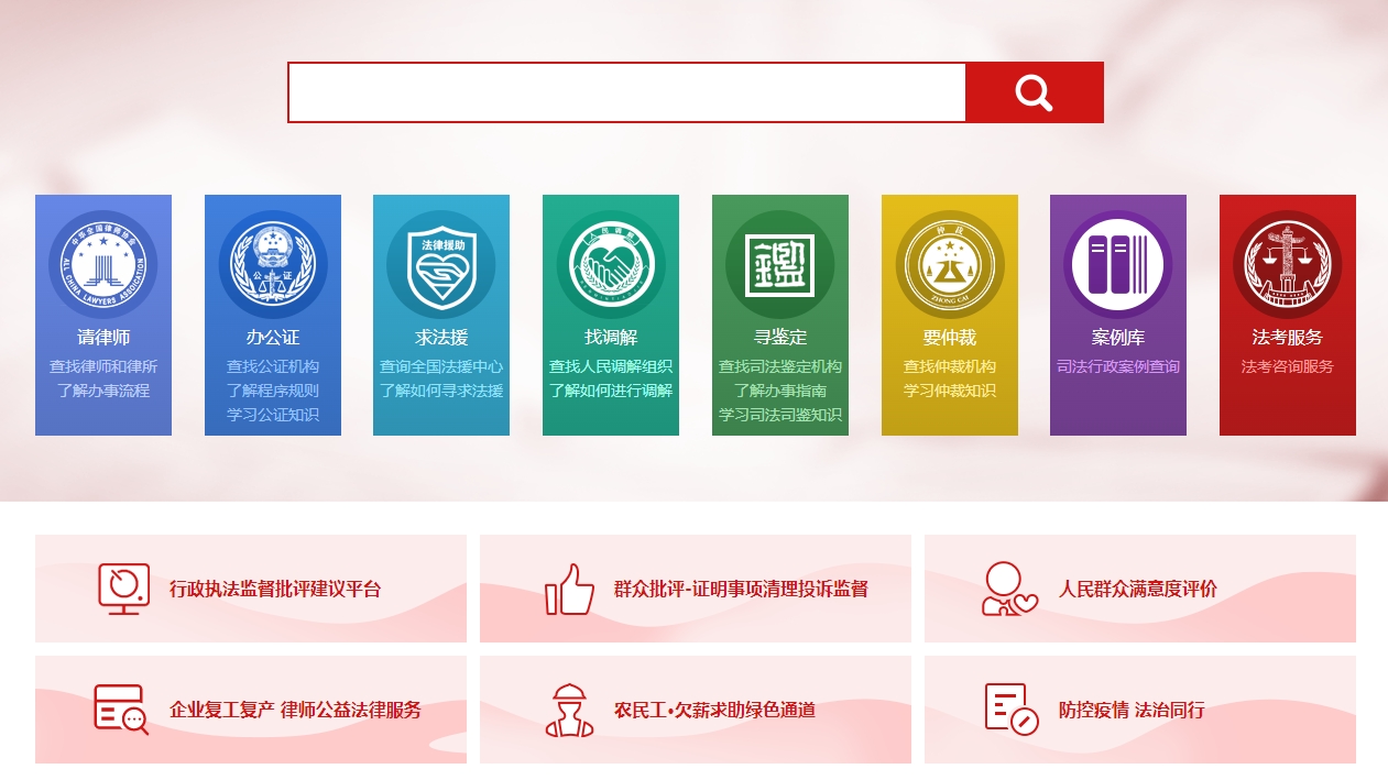 中国法律服务网由中国司法部运营,提供最具权威的法律服务。你可以使用该网站,请律师、办公证、求法援、找调解、寻鉴定、要仲裁、案例库、执法服务、法考服务。